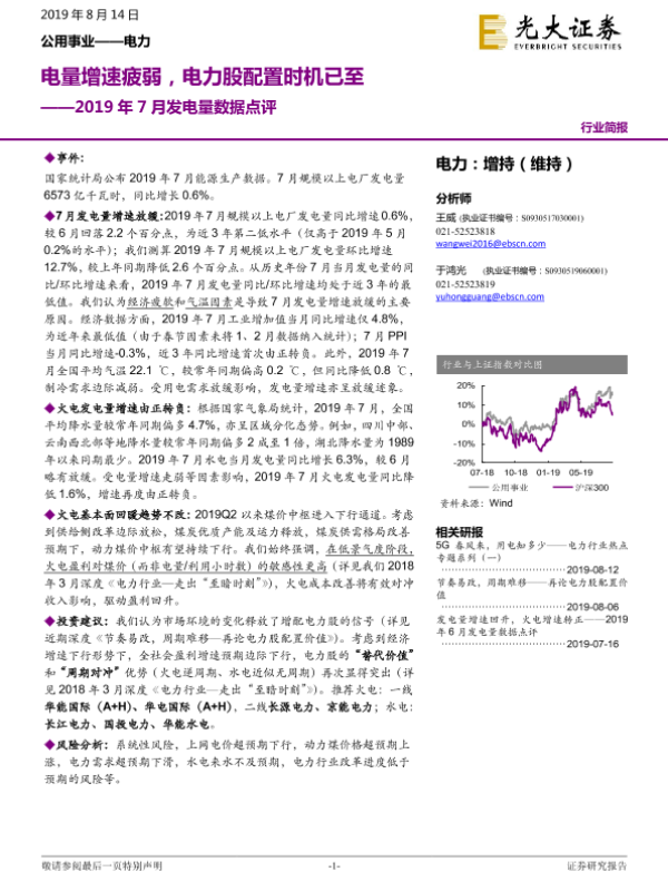 【光大证券】【20190814】2019年7月发电量数据点评:电量增速疲弱,电力股配置时机已至-4页 行业研究