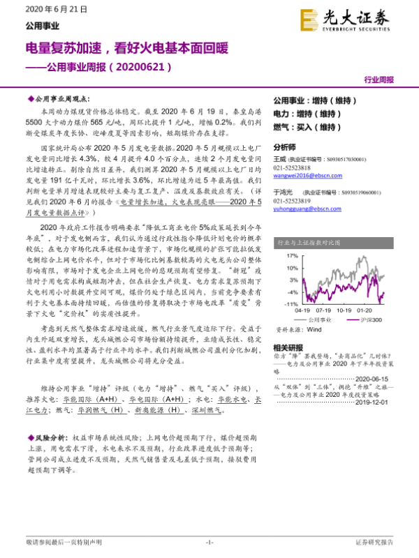 【光大证券】【20200621】公用事业周报:电量复苏加速,看好火电基本面回暖-9页 行业研究