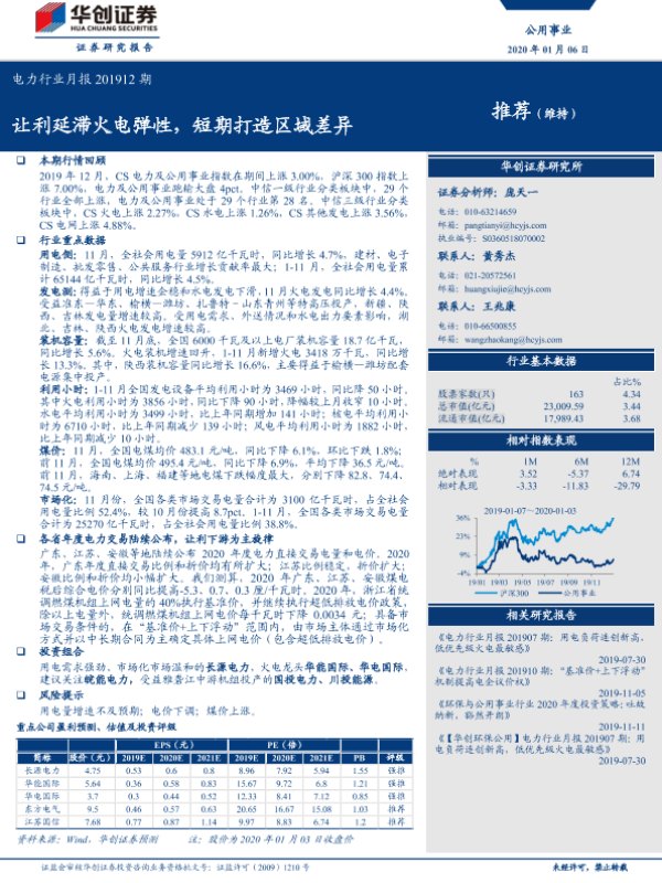 【华创证券】【20200106】电力行业月报201912期:让利延滞火电弹性,短期打造区域差异-24页 行业研究