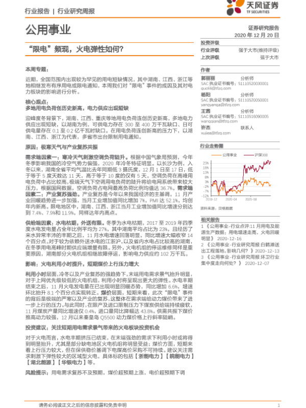 【天风证券】【20201220】公用事业行业研究周报:“限电”频现,火电弹性如何?-14页 行业研究