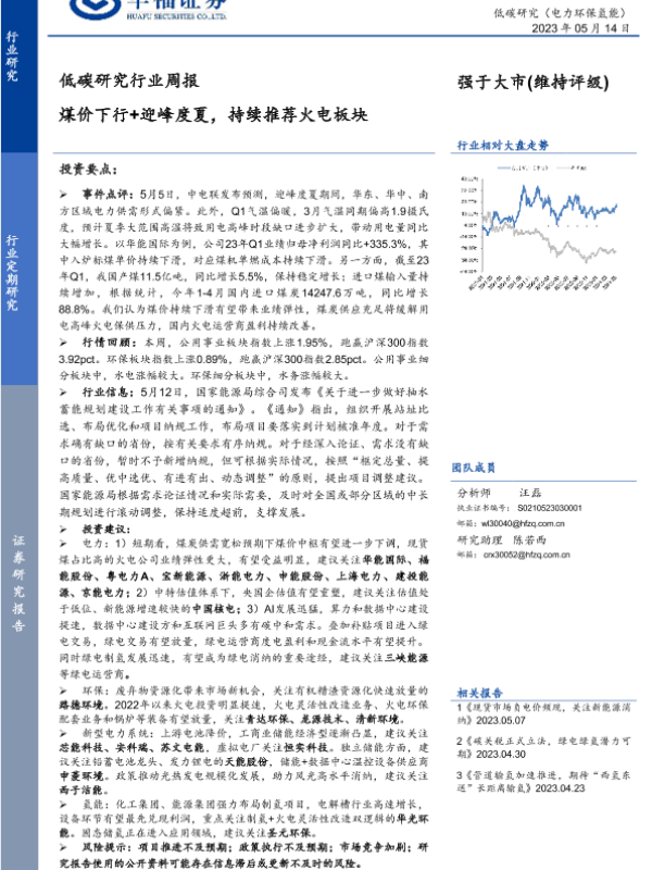 【华福证券】【20230514】低碳研究行业周报:煤价下行+迎峰度夏,持续推荐火电板块-13页 行业研究