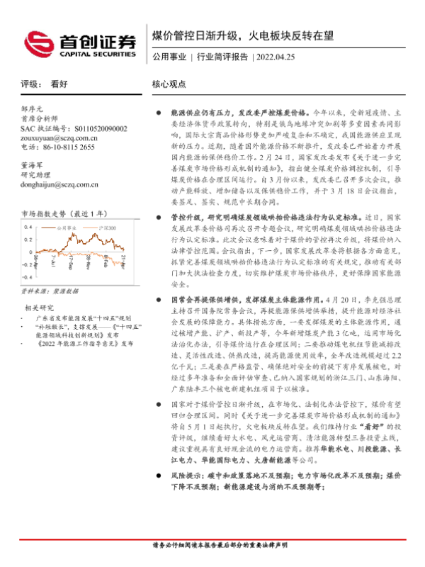 【首创证券】【20220425】煤价管控日渐升级,火电板块反转在望-12页 行业研究