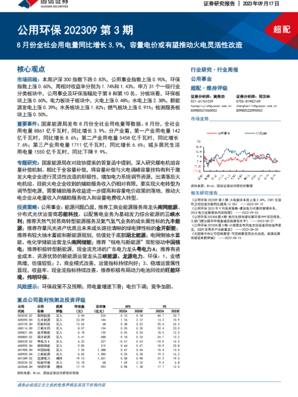 【国信证券】【20230917】8月份全社会用电量同比增长3.9%,容量电价或有望推动火电灵活性改造-28页 行业研究