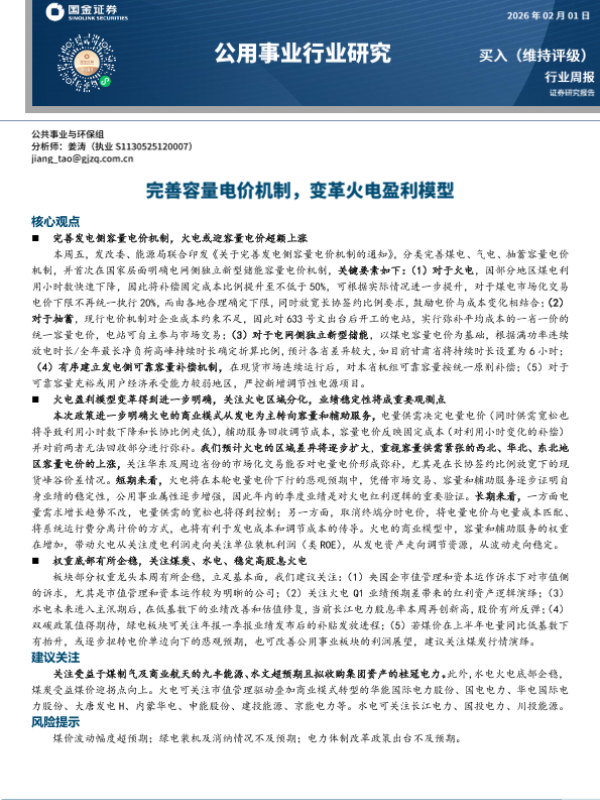 【国金证券】【202402】公用事业行业研究:完善容量电价机制,变革火电盈利模型-3页 证券期货研究报告