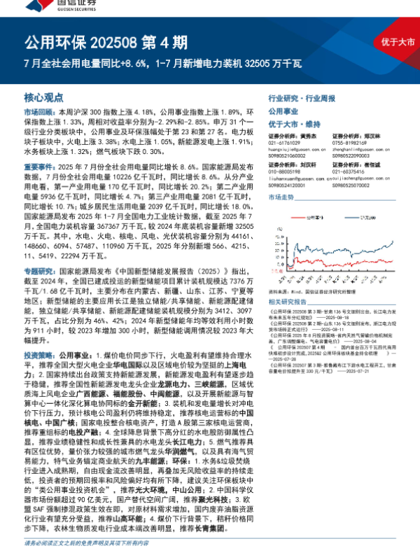 【国信证券】【202508】公用环保202508第4期:7月全社会用电量同比+8.6%,1-7月新增电力装机32505万千瓦-30页 证券期货研究报告
