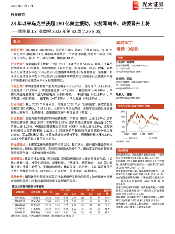 【光大证券】【20230807】国防军工行业周报2023年第33周:23年以来乌克兰获超280亿美金援助,火箭军司令、政委晋升上将-15页 行业研究