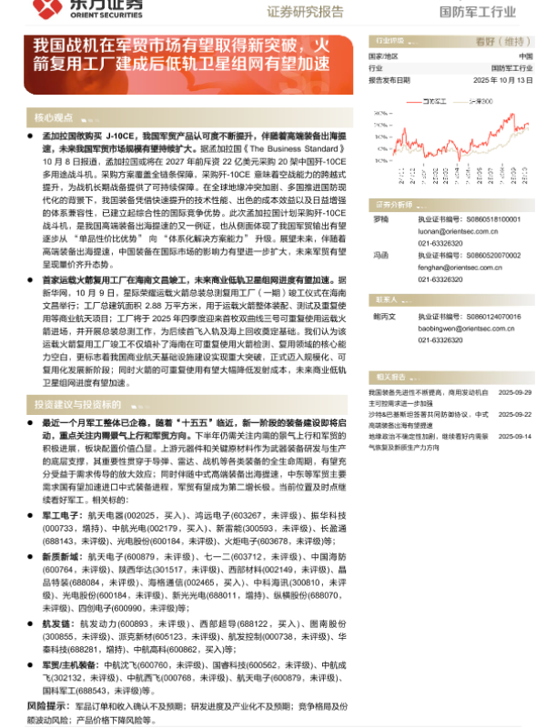 【东方证券】【202510】国防军工行业行业周报 ——我国战机在军贸市场有望取得新突破,火箭复用工厂建成后低轨卫星组网有望加速-13页 证券期货研究报告