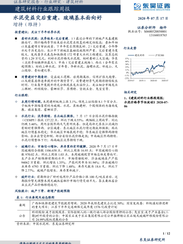 【东吴证券】【20200717】建筑材料行业跟踪周报:水泥受益灾后重建,玻璃基本面向好-12页 行业研究