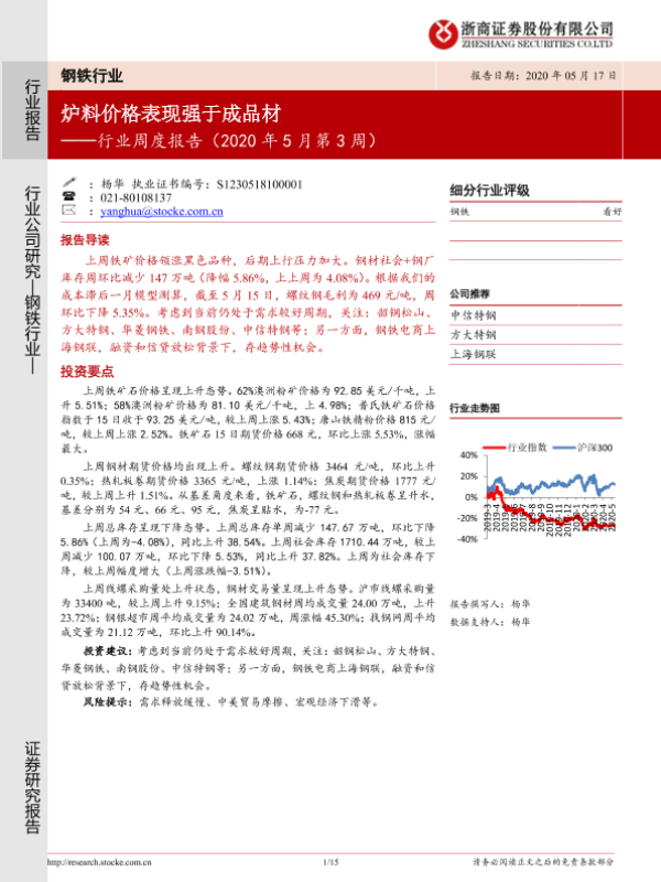 【浙商证券】【20200517】20200517-浙商证券-钢铁行业周度报告(2020年5月第3周):炉料价格表现强于成品材-15页 行业研究