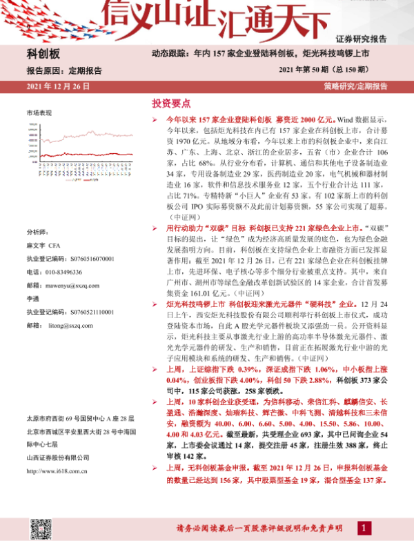 【山西证券】【20211226】动态跟踪2021年第50期(总150期):年内157家企业登陆科创板,炬光科技鸣锣上市-23页 行业研究