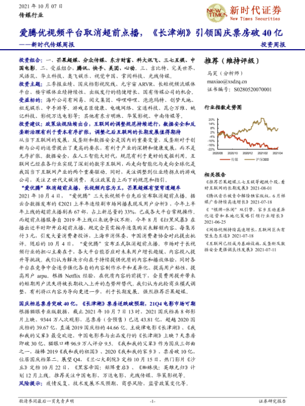 【新时代证券】【20211007】新时代传媒周报:爱腾优视频平台取消超前点播,《长津湖》引领国庆票房破40亿-19页 行业研究
