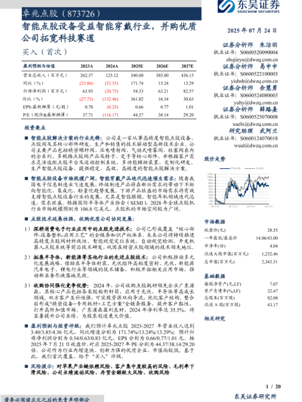 【东吴证券】【20250724】卓兆点胶(873726)智能点胶设备受益智能穿戴行业,并购优质公司拓宽科技赛道-20页 公司研究