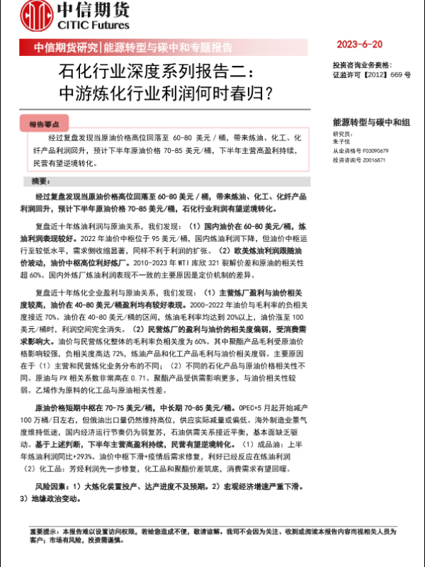 【中信期货】【20230620】石化行业深度系列报告二:中游炼化行业利润何时春归?-15页 行业研究