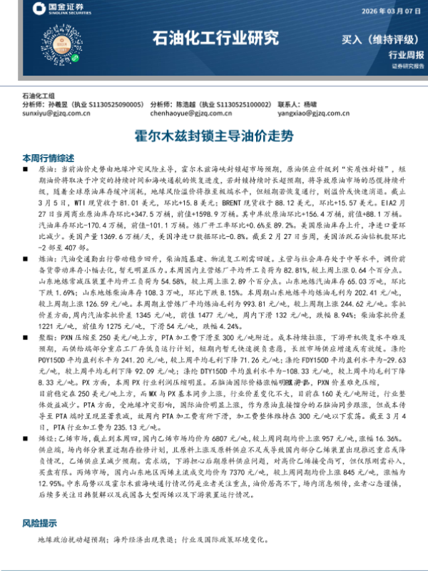 【国金证券】【202603】石油化工行业研究:霍尔木兹封锁主导油价走势-16页 证券期货研究报告