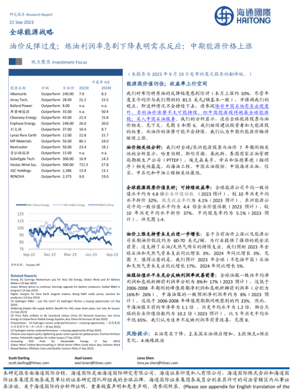 【海通国际】【20230921】全球能源行业战略:油价反弹过度;炼油利润率急剧下降表明需求反应;中期能源价格上涨-40页 行业研究
