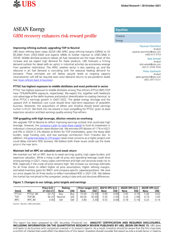 【瑞银】【20211028】瑞银-亚太地区能源行业-泰国:炼油毛利的恢复提高了风险回报状况-24页 行业研究