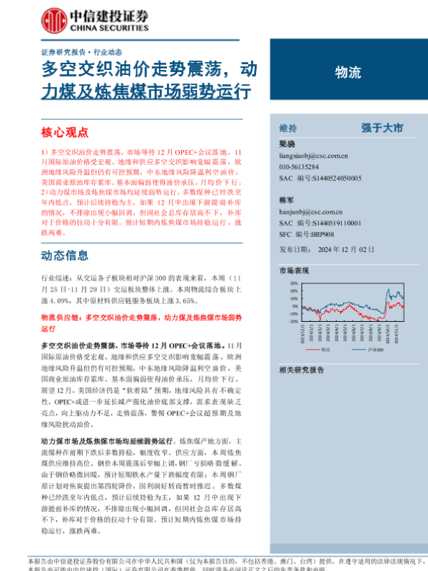【中信建投证券】【20241202】物流行业:多空交织油价走势震荡,动力煤及炼焦煤市场弱势运行-14页 行业研究