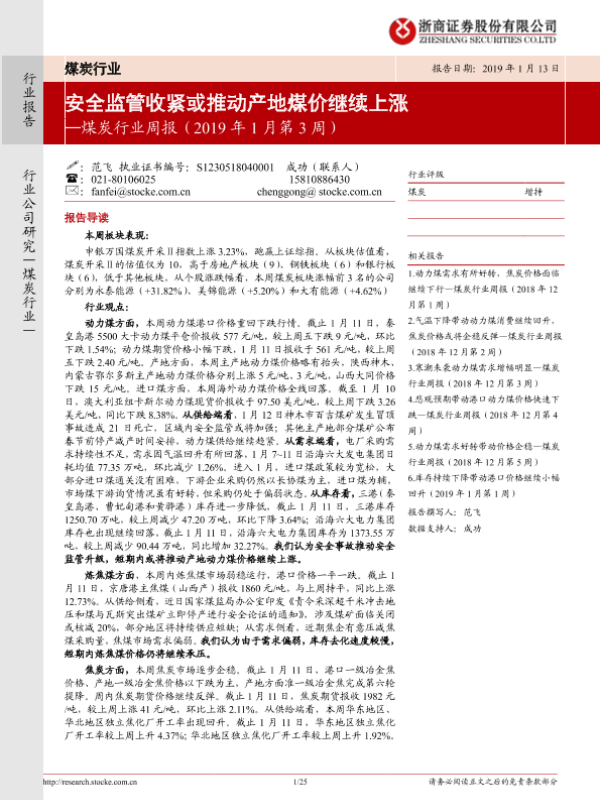 【浙商证券】【20190113】20190113-浙商证券-煤炭行业周报(2019年1月第3周):安全监管收紧或推动产地煤价继续上涨-25页 行业研究