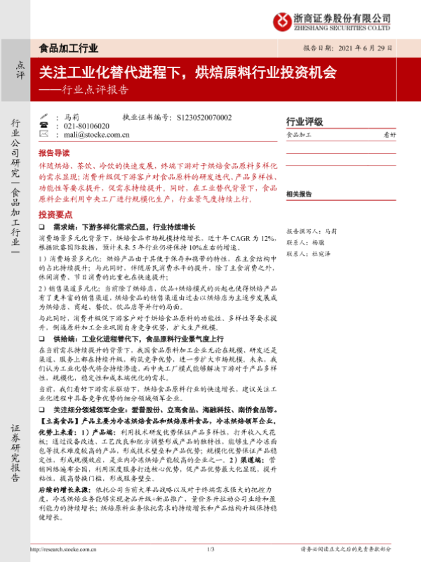【浙商证券】【20210629】20210629-浙商证券-食品加工行业点评报告:关注工业化替代进程下,烘焙原料行业投资机会-3页 行业研究