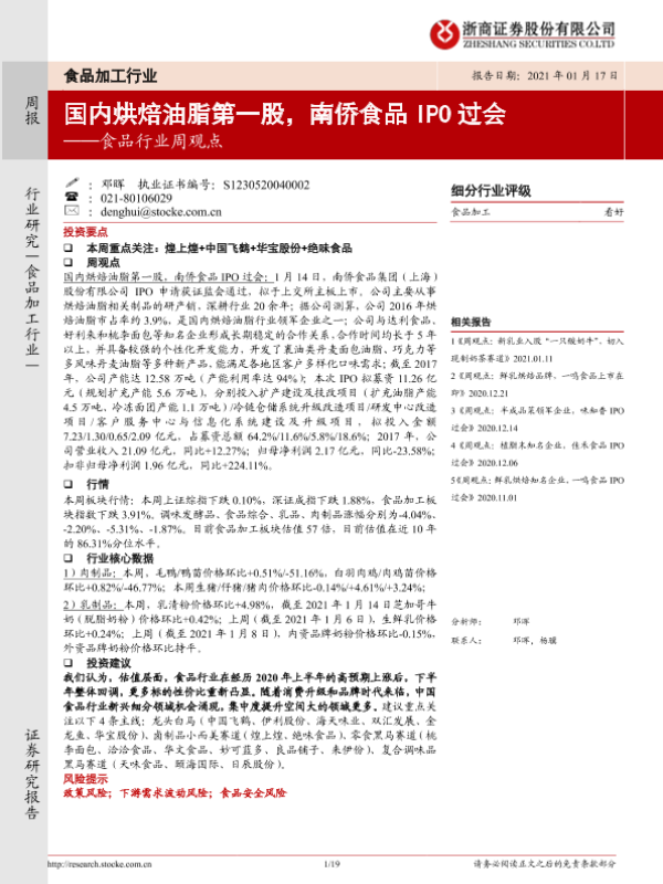 【浙商证券】【20210117】20210117-浙商证券-食品行业周观点:国内烘焙油脂第一股,南侨食品IPO过会-19页 行业研究