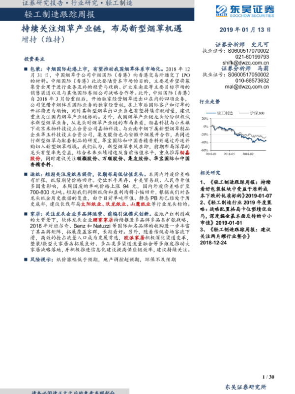 【东吴证券】【20190113】轻工制造跟踪周:持续关注烟草产业链,布局新型烟草机遇-30页 行业研究