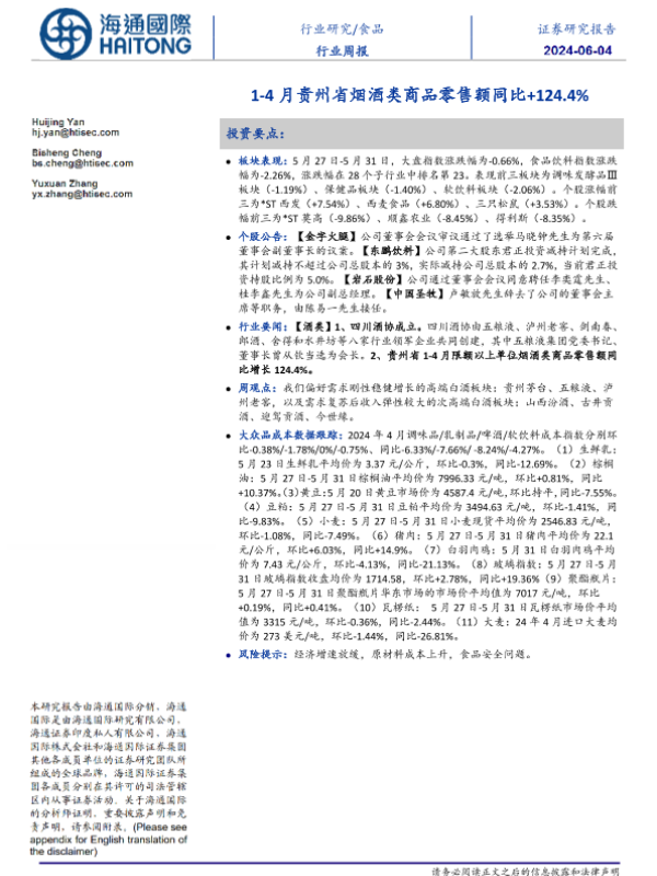 【海通国际】【20240604】20240604-海通国际-食品行业周报:1-4月贵州省烟酒类商品零售额同比+124.4%-24页 行业研究