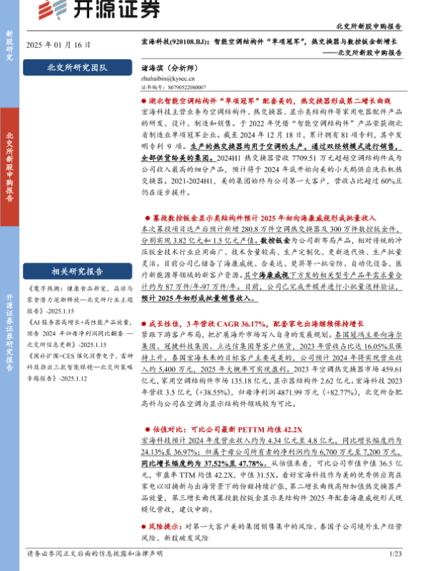 【开源证券】【20250116】宏海科技(920108)北交所新股申购报告:智能空调结构件“单项冠军”,热交换器与数控钣金新增长-23页 行业研究