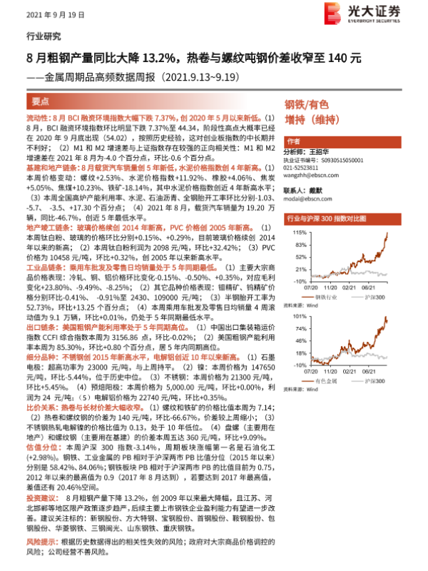 【光大证券】【20210919】金属周期品高频数据周报:8月粗钢产量同比大降13.2%,热卷与螺纹吨钢价差收窄至140元-24页 行业研究