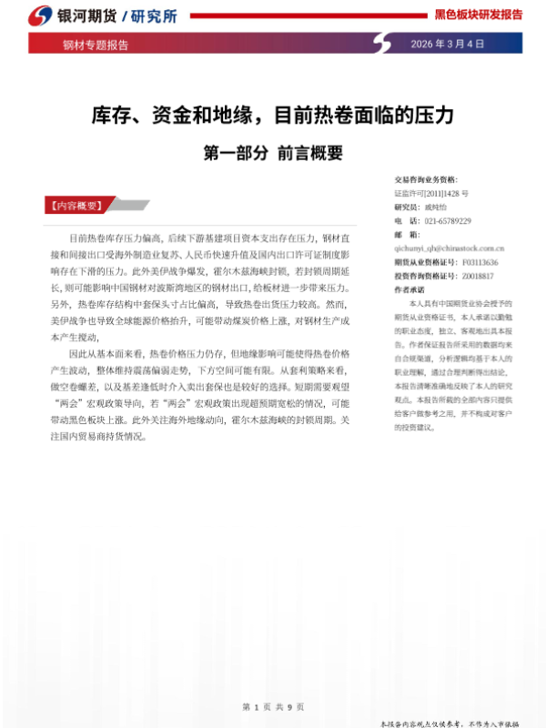 【银河期货】【202603】钢材专题报告_库存_资金和地缘_目前热卷面临的压力-9页 证券期货研究报告