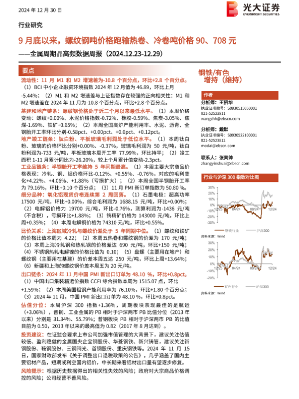 【光大证券】【20241230】20241230-光大证券-钢铁 有色行业金属周期品高频数据周报:9月底以来,螺纹钢吨价格跑输热卷、冷卷吨价格90、708元-27页 行业研究