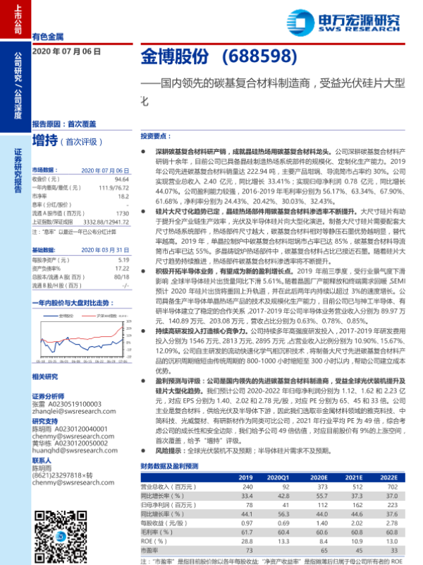 【申万宏源】【20200706】金博股份:国内领先的碳基复合材料制造商,受益光伏硅片大型化-31页 行业研究