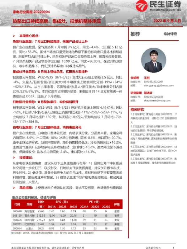 【民生证券】【20220904】家电行业周报:热泵出口持续高增,集成灶、扫地机整体承压-15页 行业研究