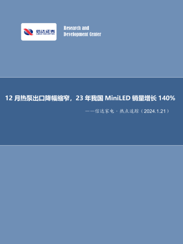 【信达证券】【20240121】信达家电·热点追踪:12月热泵出口降幅缩窄,23年我国MiniLED销量增长140%-13页 行业研究