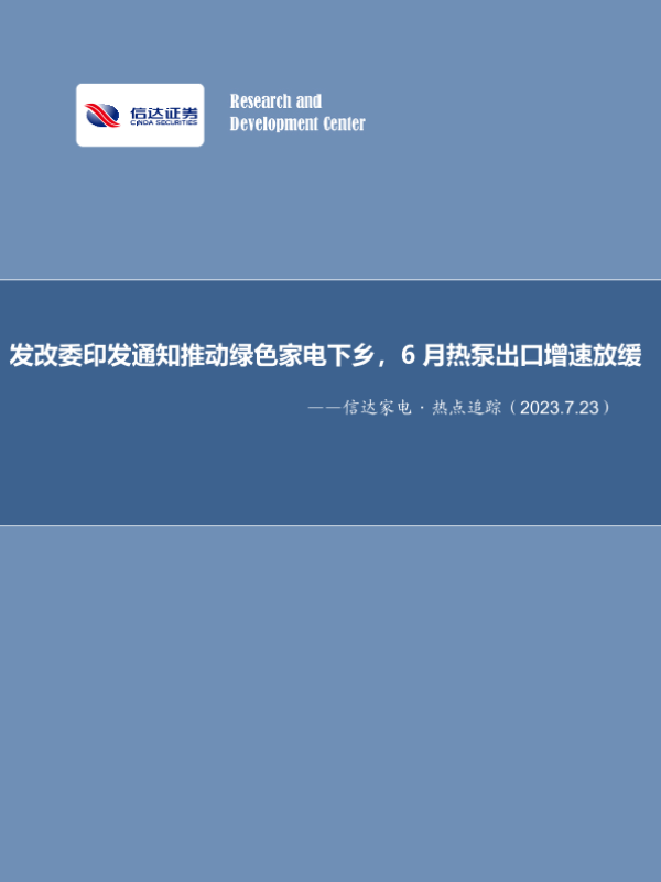 【信达证券】【20230723】信达家电·热点追踪:发改委印发通知推动绿色家电下乡,6月热泵出口增速放缓-13页 行业研究