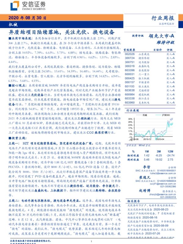 【安信证券】【20200830】20200830-安信证券-机械行业周报:异质结项目陆续落地,关注光伏、换电设备-19页 行业研究