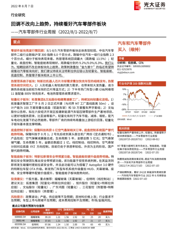 【光大证券】【20220807】20220807-光大证券-汽车零部件行业周报:回调不改向上趋势,持续看好汽车零部件板块-18页 行业研究