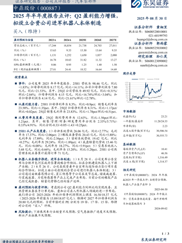 【东吴证券】【20250830】中鼎股份-2025年半年度报告点评:Q2盈利能力增强,拟设立合资公司进军机器人本体制造-3页 证券期货研究报告