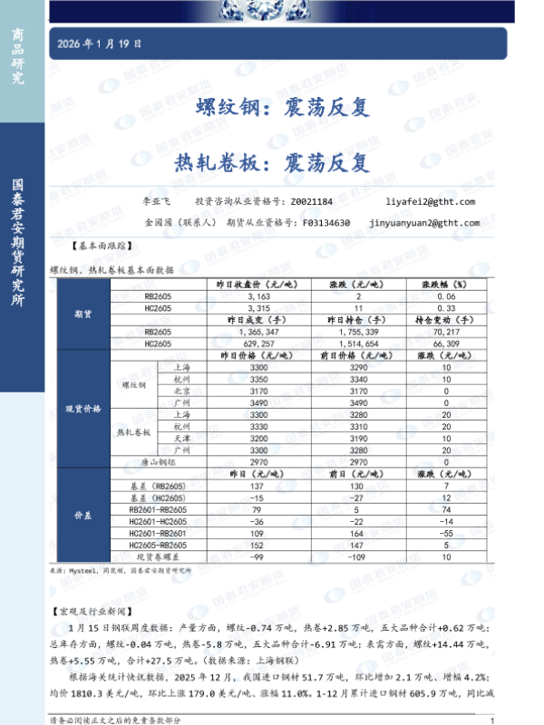 【国泰君安期货】【202601】螺纹钢:震荡反复 热轧卷板:震荡反复-3页 证券期货研究报告
