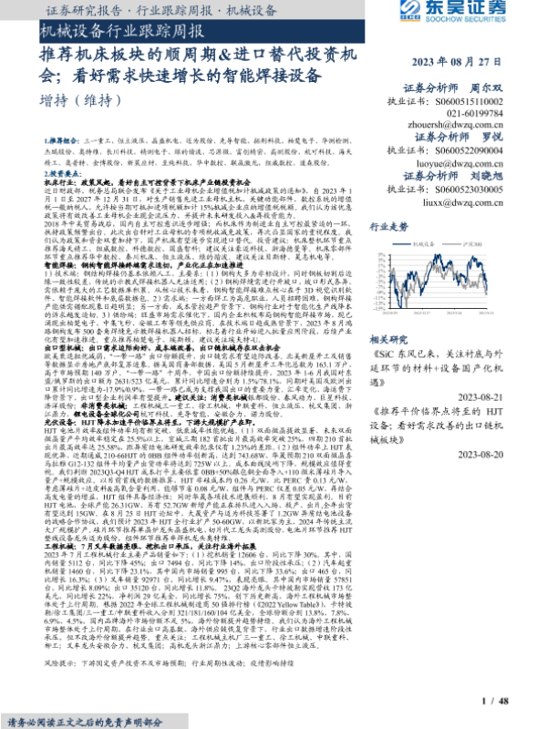 【东吴证券】【20230827】20230827-东吴证券-机械设备行业跟踪周报:推荐机床板块的顺周期&进口替代投资机会;看好需求快速增长的智能焊接设备-48页 行业研究