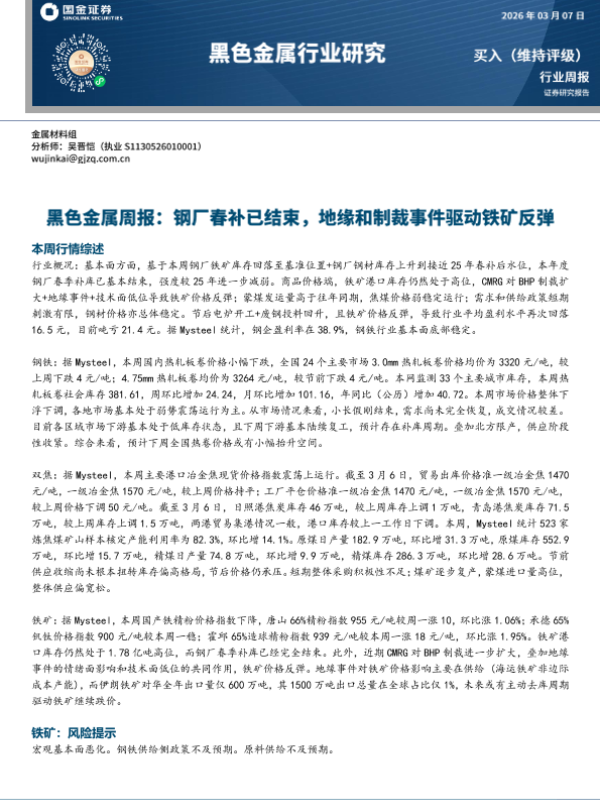 【国金证券】【202403】黑色金属周报:钢厂春补已结束,地缘和制裁事件驱动铁矿反弹-14页 证券期货研究报告