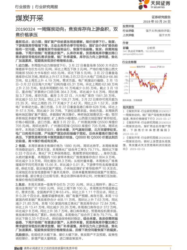 【天风证券】【20190324】20190324-天风证券-煤炭开采一周煤炭动向:焦炭库存向上游垒积,双焦价格承压-19页 行业研究