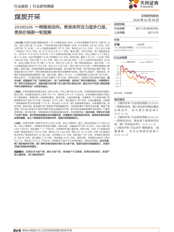 【天风证券】【20190106】20190106-天风证券-一周煤炭动向:焦炭库存压力逐步凸显,焦炭价格新一轮提降-19页 行业研究