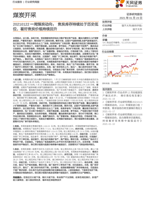 【天风证券】【20210123】20210123-天风证券-一周煤炭动向:焦炭库存持续处于历史低位,看好焦炭价格持续回升-19页 行业研究