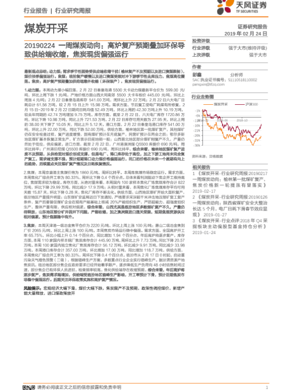 【天风证券】【20190224】20190224-天风证券-煤炭开采一周煤炭动向:高炉复产预期叠加环保导致供给端收缩,焦炭现货偏强运行-19页 行业研究