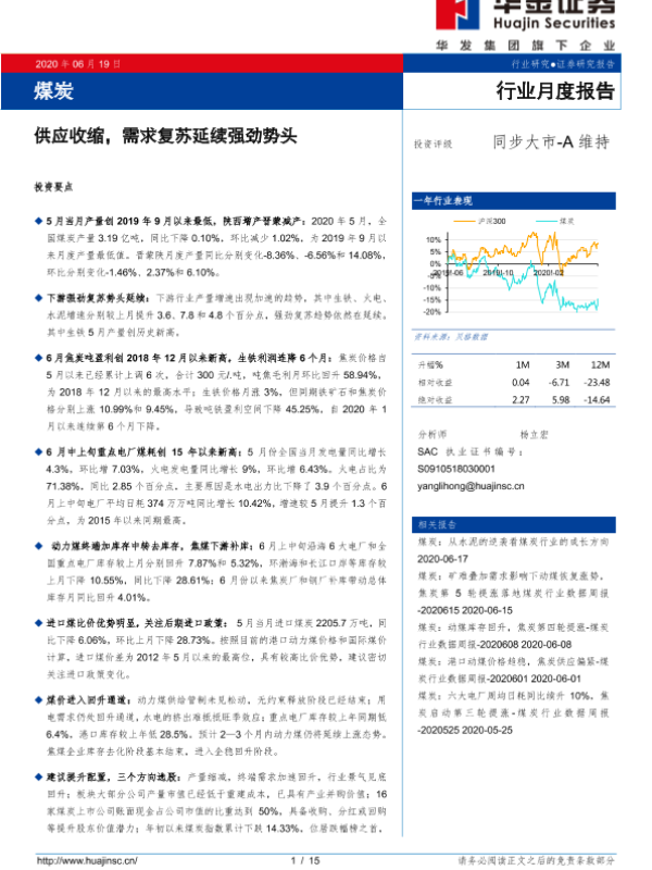 【华金证券】【20200619】20200619-华金证券-煤炭行业月度报告:供应收缩,需求复苏延续强劲势头-15页 行业研究