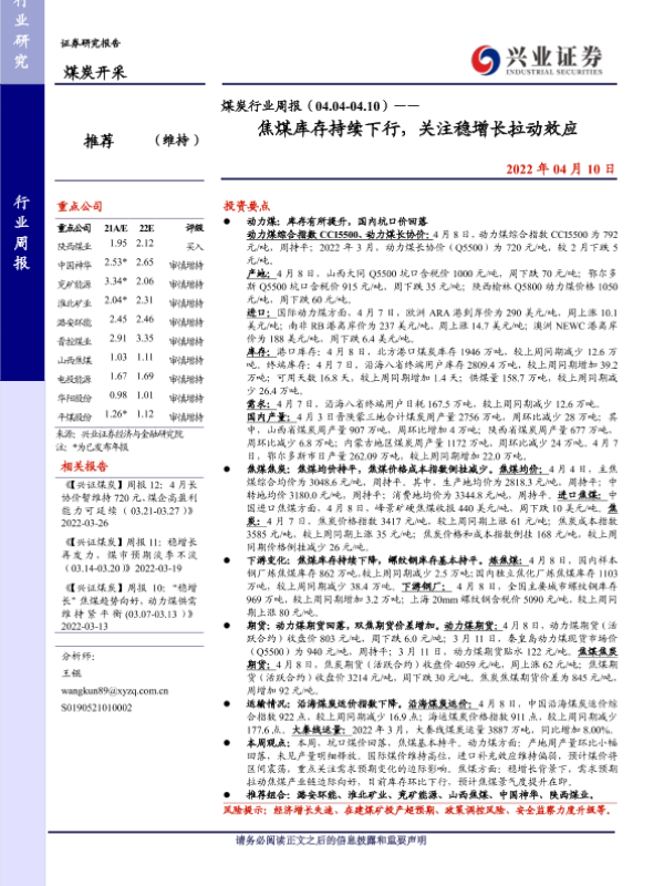 【兴业证券】【20220410】煤炭行业周报(04.04-04.10)——焦煤库存持续下行,关注稳增长拉动效应-12页 行业研究