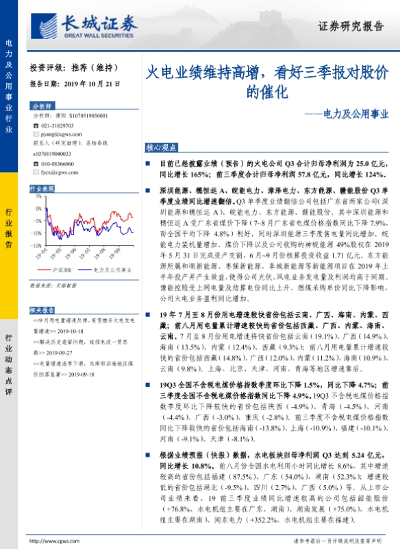 【长城证券】【20191021】电力及公用事业:火电业绩维持高增,看好三季报对股价的催化-8页 行业研究