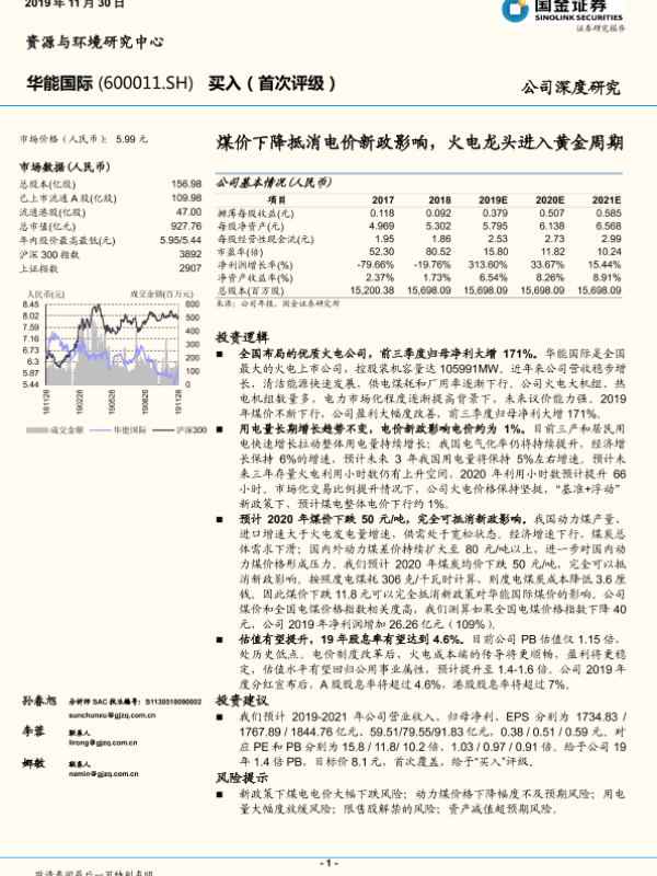 【国金证券】【20191130】煤价下降抵消电价新政影响,火电龙头进入黄金周期-25页 行业研究