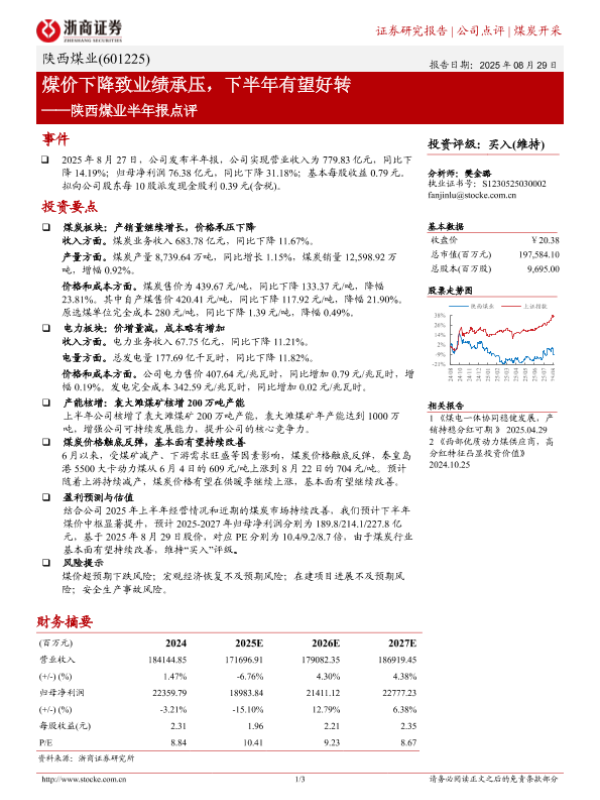 【浙商证券】【20250829】陕西煤业-煤价下降致业绩承压,下半年有望好转-3页 证券期货研究报告
