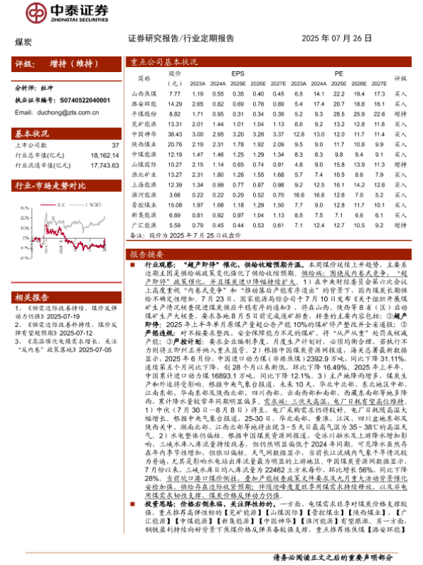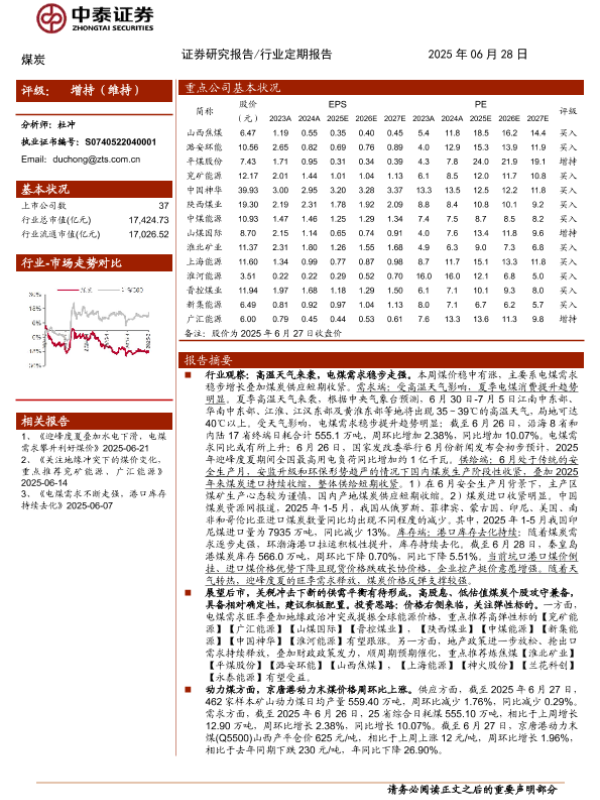 【中泰证券】【20250628】煤炭行业:夏季高温带动电煤需求增长,煤价反弹支撑较强关注弹性-23页 证券期货研究报告